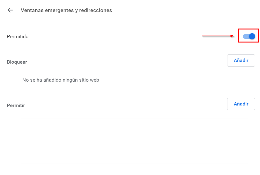Acceder a Configuración, Configuración avanzada, Configuración de contenido, Ventanas emergentes y redirecciones.