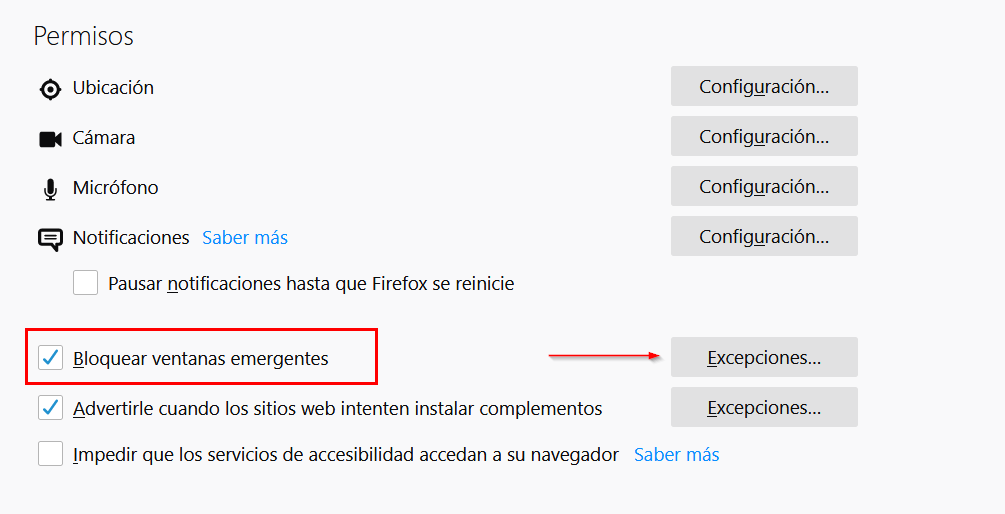 En Bloqueador de elementos emergentes, desactiva la casilla Activar el bloqueador de elementos emergentes y, luego, haz clic en Aceptar.
