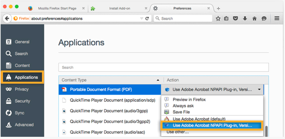 En Firefox para visualizar los documentos PDF que incorporan imágenes, como pueden ser PDF escaneados, es necesario realizar una configuración previa. Teniendo abierto el navegador Firefox, acceder a Opciones -> General -> Aplicaciones, localizar el Tipo de Contenido PDF y selecciona (Usar Adobe Reader (predeterminado). Con esto se usará Adobe Reader para la visualización de documentos PDF, en lugar del plugin de Firefox.